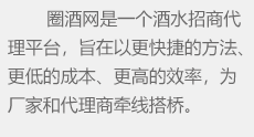 圈酒招商網主要為白酒、啤酒、葡萄酒、保健酒等酒類企業(yè)提供酒水招商、代理批發(fā)、加盟等信息